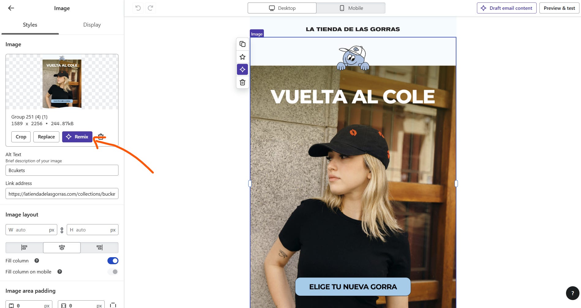 Esta última es la que me parece increíble, podrás subir una imagen cualquiera a Klaviyo y hacer referencia a tu catálogo de productos para que automáticamente Klaviyo lo coja y en base a tu descripción lo añada a la imagen.